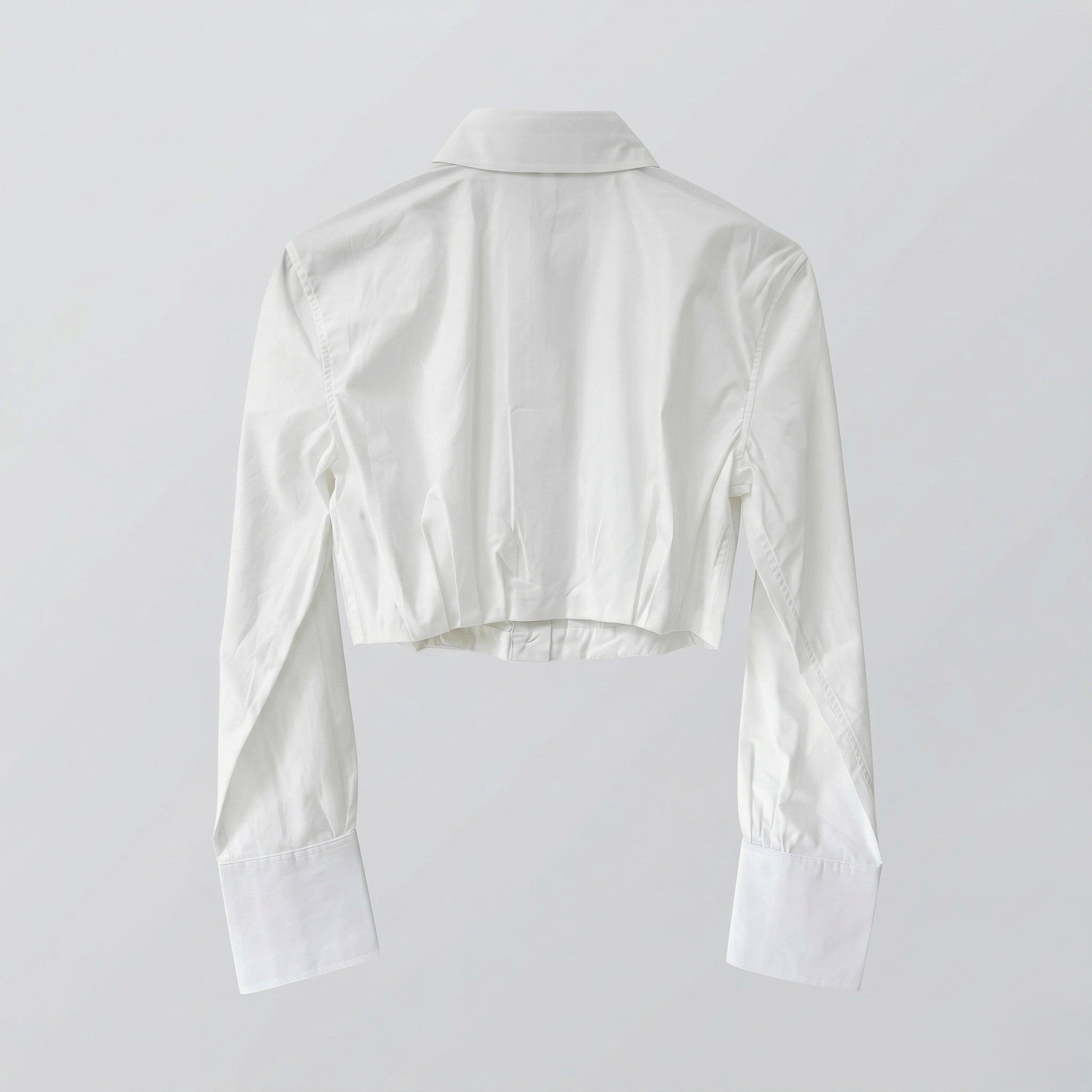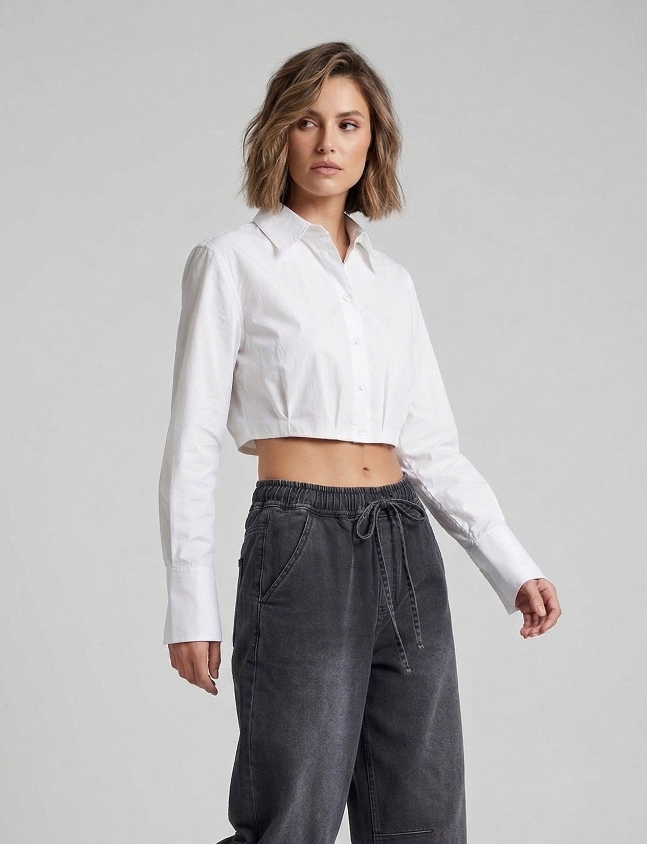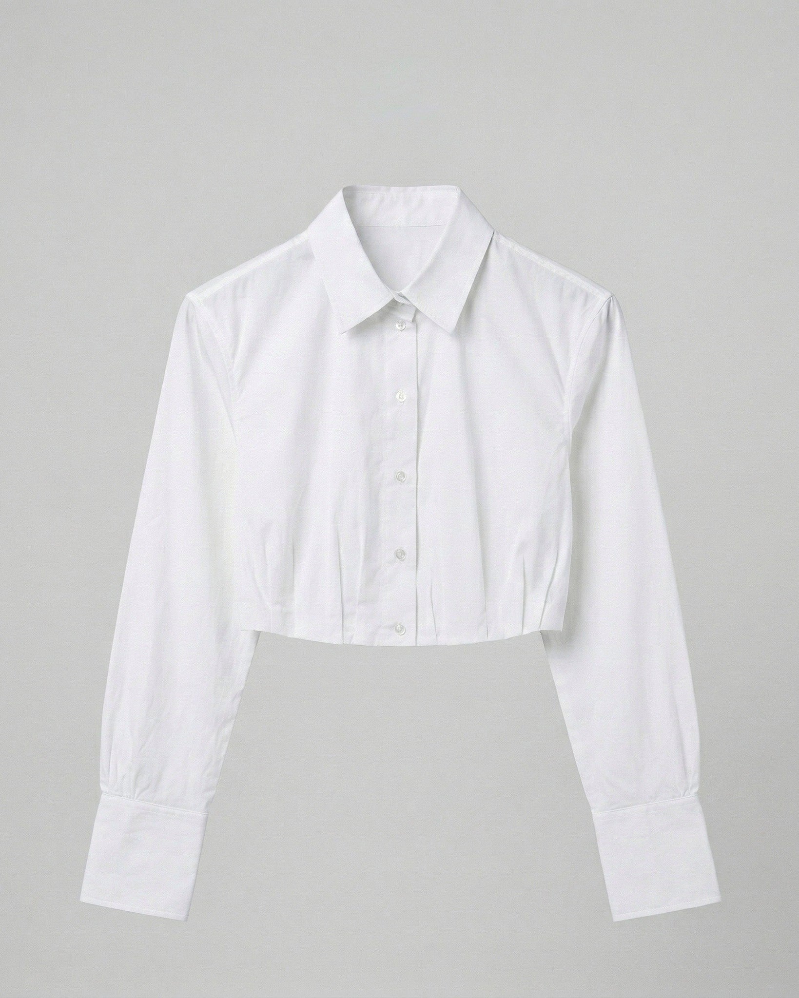 -Our Button-Up Crop Top offers a modern, tailored take on a classic shirting style. Designed with a structured yet feminine silhouette, this cropped button-up features a soft pleating that adds shape and dimension. The cinched hem creates a flattering, defined fit, making it perfect for pairing with high-rise denim. This style brings a fresh, polished feel to everyday dressing.